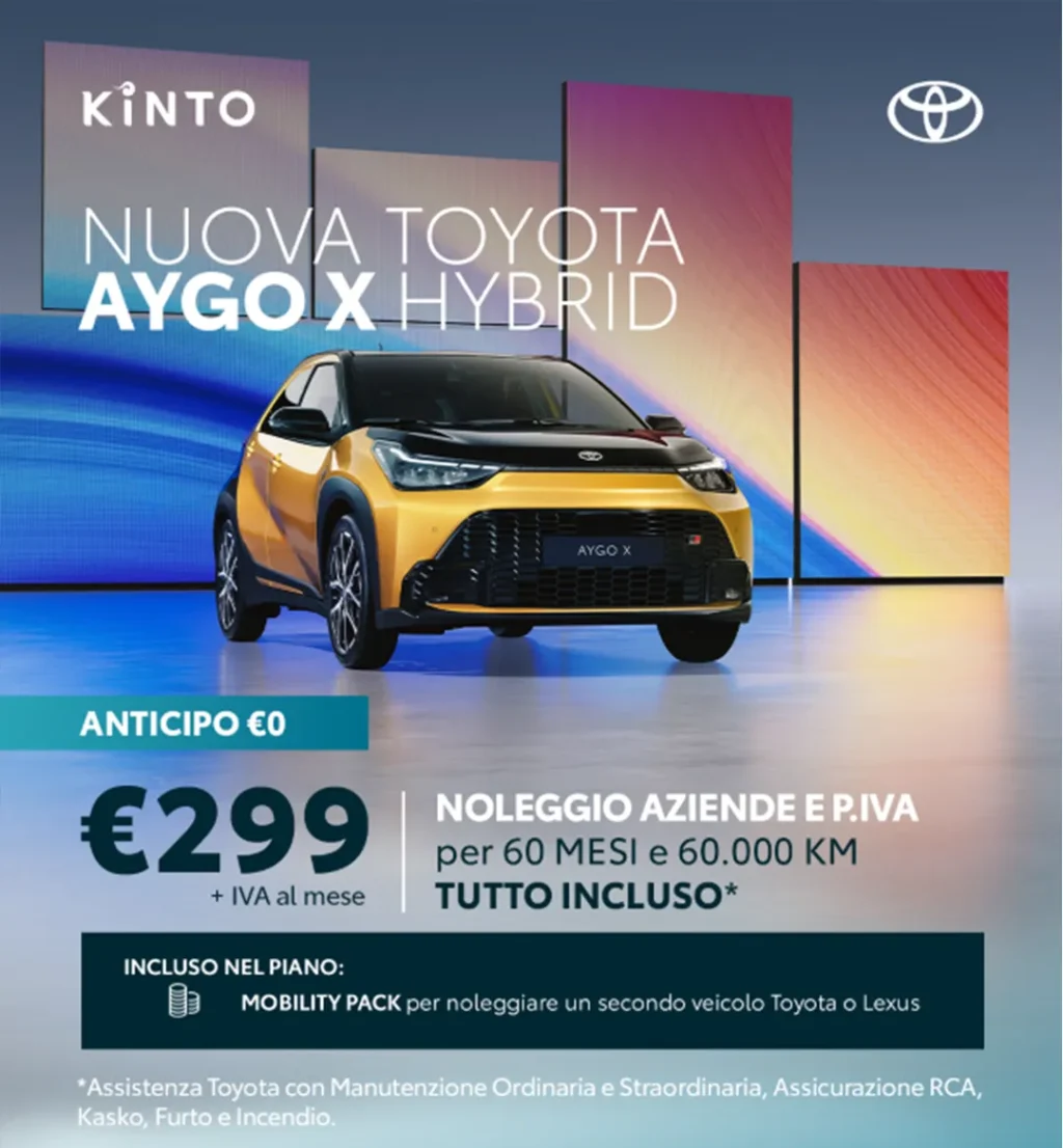 Canone applicato solo nel caso di noleggio della vettura con KINTO Italia S.p.A. Tutti gli importi sono da intendersi al mese, per 60 mesi e 60.000 km totali, IVA esclusa, salvo approvazione KINTO Italia S.p.A. Il canone pubblicizzato si riferisce a Nuova Aygo X Hybrid, € 299,00 al mese, anticipo € 0. Canone ed anticipo indicati sono comprensivi del contributo del Concessionario al costo complessivo del noleggio pari ad € 328 + a condizione che il Cliente abbia in precedenza inserito una richiesta di preventivo online sul sito toyota.it o kinto-mobility.it riservata a P. IVA e società. Sono incluse le coperture assicurative con le seguenti condizioni: massimale RCA pari a € 26.000.000 con franchigia a carico del cliente pari a € 500, Garanzia Furto & Incendio con Scoperto 10% minimo € 500 a carico del Cliente e veicolo sostitutivo per 30 giorni solo in caso di Furto, Eventi naturali, Garanzia Kasko con franchigia pari a € 500 a carico del Cliente, PAI con massimale pari a € 50.000. Il canone riportato è un esempio calcolato utilizzando i parametri assicurativi della provincia di Torino. Il canone calcolato su altre province potrebbe subire variazioni. Altri servizi inclusi: manutenzione ordinaria e straordinaria in rete ufficiale Toyota, assistenza stradale 24h 7 giorni su 7 con servizio di traino presso il centro assistenza KINTO più vicino, immatricolazione, montaggio ed attivazione dispositivo antifurto LoJack Classic, messa su strada. Offerta valida per contratti sottoscritti sino al 30/11/2025, presso i Concessionari che aderiscono all’iniziativa.