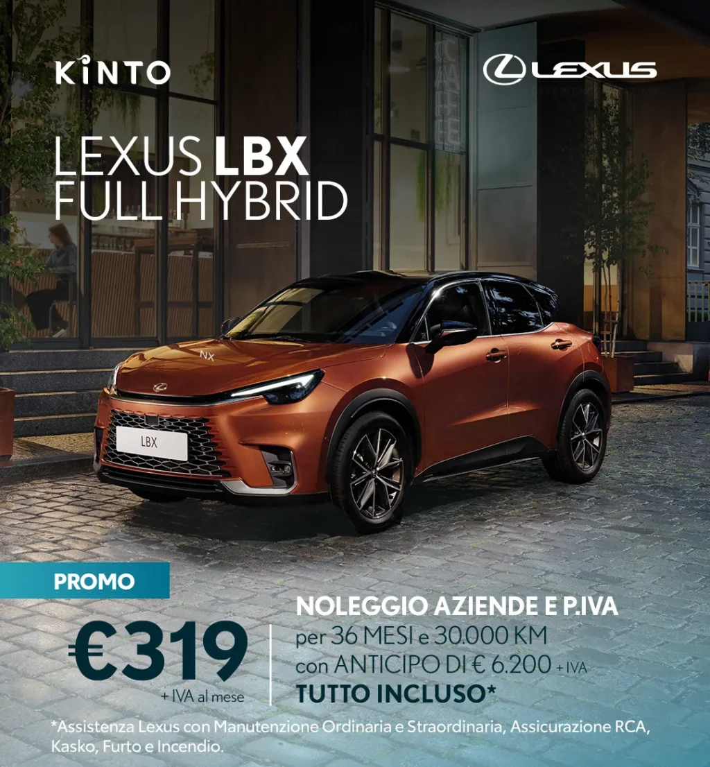 Condizioni generali dell’offerta KINTO One. Offerta valida su LEXUS LBX Full Hybrid Class. Canone applicato solo nel caso di noleggio della vettura con KINTO Italia S.p.A. Canone € 319,00 al mese per 36 mesi e 30.000 km totali, anticipo € 6.200,00, IVA esclusa. Sono incluse le coperture assicurative con le seguenti condizioni: massimale RCA pari a € 26.000.000 con franchigia a carico del cliente pari a € 500, Garanzia Furto & Incendio con Scoperto 10% minimo € 500 a carico del Cliente e veicolo sostitutivo per 30 giorni solo in caso di Furto, Eventi naturali, Garanzia Kasko con franchigia pari a € 500 a carico del Cliente, PAI con massimale pari a € 50.000. Il canone riportato è un esempio calcolato utilizzando i parametri assicurativi della provincia di Torino. Il canone calcolato su altre province potrebbe subire variazioni. Altri servizi inclusi: manutenzione ordinaria e straordinaria in rete ufficiale Lexus, assistenza stradale 24h 7 giorni su 7 con servizio di traino presso il centro assistenza KINTO più vicino, immatricolazione, montaggio ed attivazione dispositivo antifurto LoJack Classic, messa su strada. Offerta valida per contratti sottoscritti entro il 30/11/2025, presso i concessionari che aderiscono all’iniziativa. Valori massimi WLTP riferiti alla gamma LBX: consumo combinato 4.8 l/100km, emissioni CO2 109 g/km (WLTP – Worldwide harmonized Light vehicles Test Procedure ai sensi del Regolamento UE 2017/1151).