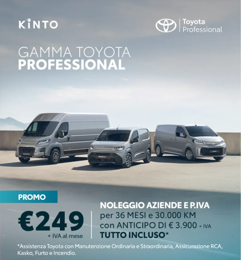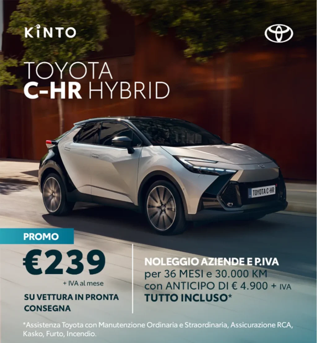 Canone applicato solo nel caso di noleggio della vettura con KINTO Italia S.p.A. Tutti gli importi sono da intendersi al mese, per 36 mesi e 30.000 km totali, IVA esclusa, salvo approvazione KINTO Italia S.p.A. Il canone pubblicizzato si riferisce a Toyota C-HR 1.8 Hybrid Active, € 239,00 al mese, anticipo € 4.900,00. Canone ed anticipo indicati sono comprensivi del contributo del Concessionario al costo complessivo del noleggio pari ad € 328 + IVA a condizione che il Cliente abbia in precedenza inserito una richiesta di preventivo online sul sito toyota.it o kinto-mobility.it riservata a P. IVA e società. Sono incluse le coperture assicurative con le seguenti condizioni: massimale RCA pari a € 26.000.000 con franchigia a carico del cliente pari a € 500, Garanzia Furto & Incendio con Scoperto 10% minimo € 500 a carico del Cliente, Garanzia Kasko con franchigia pari a € 500 a carico del Cliente, PAI con massimale pari a € 50.000. Il canone riportato è un esempio calcolato utilizzando i parametri assicurativi della provincia di Torino. Il canone calcolato su altre province potrebbe subire variazioni. Altri servizi inclusi: manutenzione ordinaria e straordinaria in rete ufficiale Toyota, assistenza stradale 24h 7 giorni su 7 con servizio di traino presso il centro assistenza KINTO più vicino, immatricolazione, montaggio ed attivazione dispositivo antifurto LoJack Classic, messa su strada. Offerta valida per contratti sottoscritti entro il 30/11/2025, presso i concessionari che aderiscono all’iniziativa.