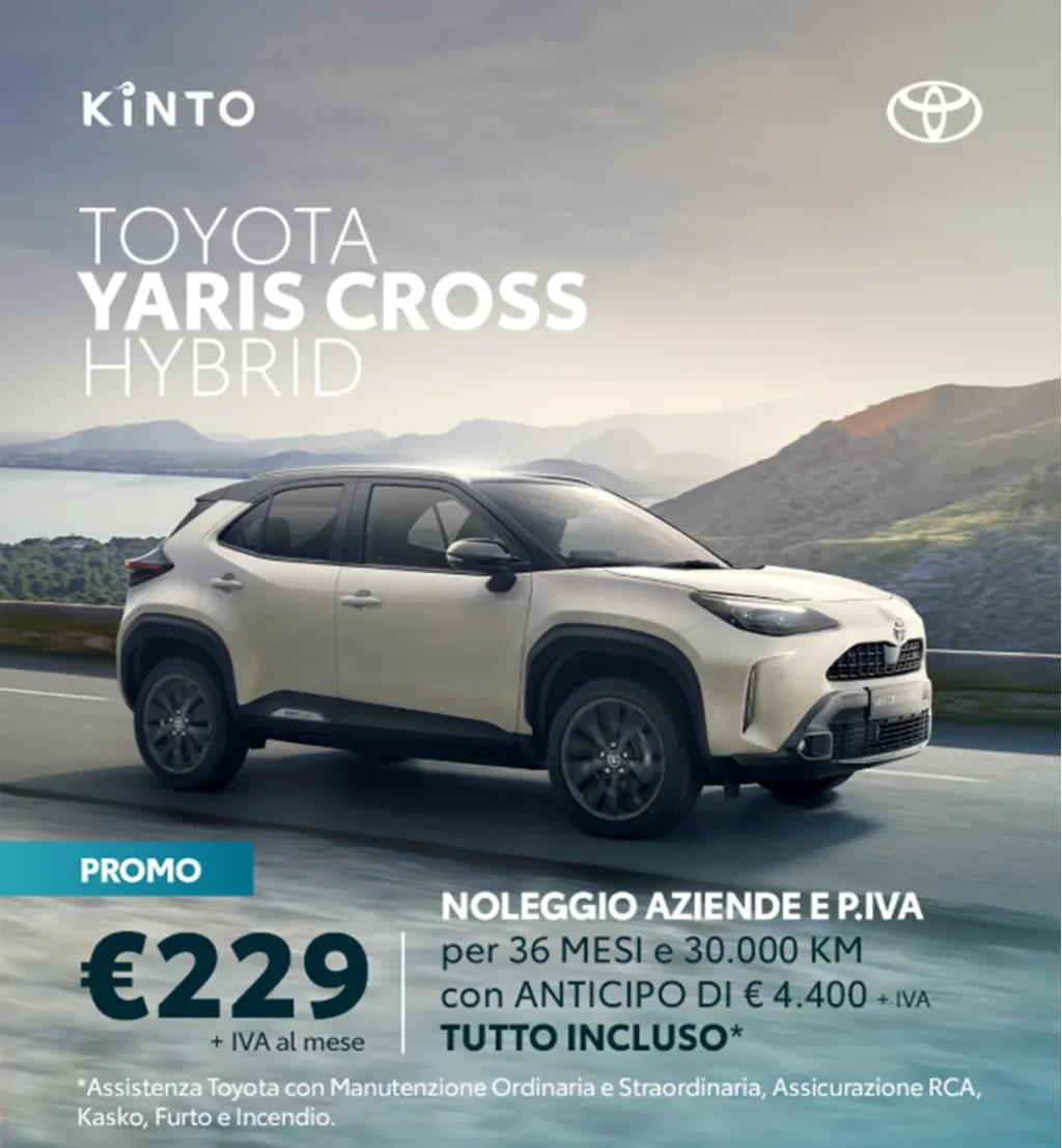 Canone applicato solo nel caso di noleggio della vettura con KINTO Italia S.p.A. Tutti gli importi sono da intendersi al mese, per 36 mesi e 30.000 km totali, IVA esclusa, salvo approvazione KINTO Italia S.p.A. Il canone pubblicizzato si riferisce a Yaris Cross 115 Active FWD, € 229,00 al mese, anticipo € 4.400,00. Canone ed anticipo indicati sono comprensivi del contributo del Concessionario al costo complessivo del noleggio pari ad € 328 + IVA a condizione che il Cliente abbia in precedenza inserito una richiesta di preventivo online sul sito toyota.it o kinto-mobility.it riservata a P. IVA e società. Sono incluse le coperture assicurative con le seguenti condizioni: massimale RCA pari a € 26.000.000 con franchigia a carico del cliente pari a € 500, Garanzia Furto & Incendio con Scoperto 10% minimo € 500 a carico del Cliente, Garanzia Kasko con franchigia pari a € 500 a carico del Cliente, PAI con massimale pari a € 50.000. Il canone riportato è un esempio calcolato utilizzando i parametri assicurativi della provincia di Torino. Il canone calcolato su altre province potrebbe subire variazioni. Altri servizi inclusi: manutenzione ordinaria e straordinaria in rete ufficiale Toyota, assistenza stradale 24h 7 giorni su 7 con servizio di traino presso il centro assistenza KINTO più vicino, immatricolazione, montaggio ed attivazione dispositivo antifurto LoJack Classic, messa su strada. Offerta valida per contratti sottoscritti entro il 30/11/2025, presso i concessionari che aderiscono all’iniziativa.