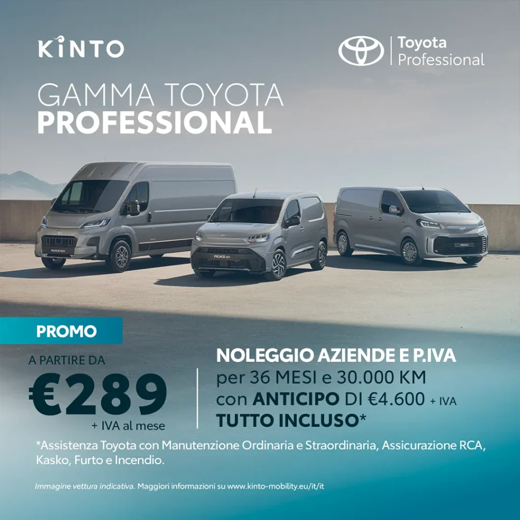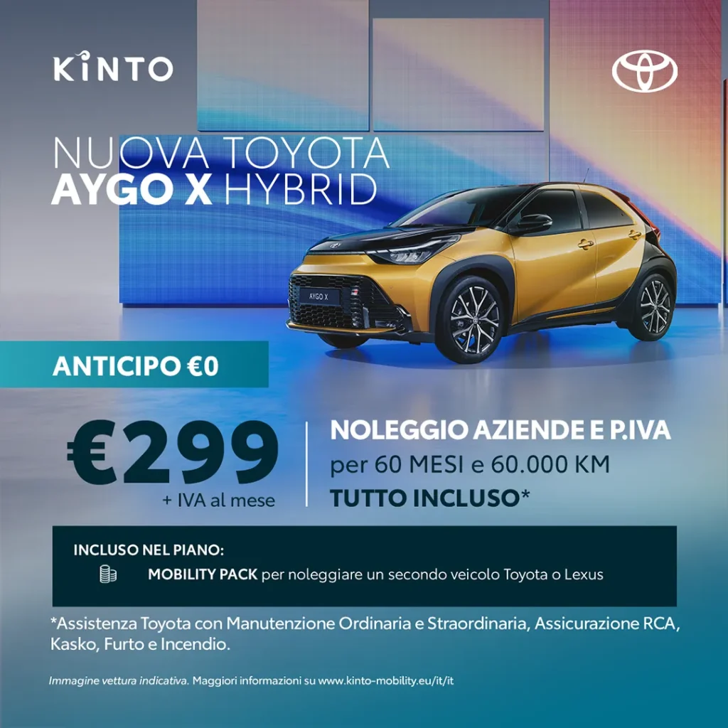 Canone applicato solo nel caso di noleggio della vettura con KINTO Italia S.p.A. Tutti gli importi sono da intendersi al mese, per 60 mesi e 60.000 km totali, IVA esclusa, salvo approvazione KINTO Italia S.p.A. Il canone pubblicizzato si riferisce a Toyota Aygo X HEV, € 299,00 al mese, anticipo € 0. Canone ed anticipo indicati sono comprensivi del contributo del Concessionario al costo complessivo del noleggio pari ad € 328 + IVA a condizione che il Cliente abbia in precedenza inserito una richiesta di preventivo online sul sito toyota.it o kinto-mobility.it. Sono incluse le coperture assicurative con le seguenti condizioni: massimale RCA pari a € 26.000.000 con franchigia a carico del cliente pari a € 500, Garanzia Furto & Incendio con Scoperto 10% minimo € 500 a carico del Cliente e veicolo sostitutivo per 30 giorni solo in caso di Furto, Eventi naturali, Garanzia Kasko con franchigia pari a € 500 a carico del Cliente, PAI con massimale pari a €50.000. Riservata a P. IVA e società. Il canone riportato è un esempio calcolato utilizzando i parametri assicurativi della provincia di Torino. Il canone calcolato su altre province potrebbe subire variazioni. Altri servizi inclusi: manutenzione ordinaria e straordinaria in rete ufficiale Toyota, assistenza stradale 24h 7 giorni su 7 con servizio di traino presso il centro assistenza KINTO più vicino, immatricolazione, montaggio ed attivazione dispositivo antifurto LoJack Classic, messa su strada. Offerta valida per contratti sottoscritti sino al 31/12/2025, presso i Concessionari che aderiscono all’iniziativa.