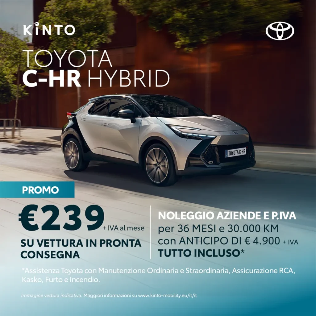 Canone applicato solo nel caso di noleggio della vettura con KINTO Italia S.p.A. Tutti gli importi sono da intendersi al mese, per 36 mesi e 30.000 km totali, IVA esclusa, salvo approvazione KINTO Italia S.p.A. Il canone pubblicizzato si riferisce a Toyota C-HR 2.0 Plug-in Hybrid 220 Trend FWD, € 339,00 al mese, anticipo € 4.900,00. Canone ed anticipo indicati sono comprensivi del contributo del Concessionario al costo complessivo del noleggio pari ad € 328 + IVA a condizione che il Cliente abbia in precedenza inserito una richiesta di preventivo online sul sito toyota.it o kinto-mobility.it riservata a P. IVA e società. Sono incluse le coperture assicurative con le seguenti condizioni: massimale RCA pari a € 26.000.000 con franchigia a carico del cliente pari a € 500, Garanzia Furto & Incendio con Scoperto 10% minimo € 500 a carico del Cliente, Garanzia Kasko con franchigia pari a € 500 a carico del Cliente, PAI con massimale pari a € 50.000. Il canone riportato è un esempio calcolato utilizzando i parametri assicurativi della provincia di Torino. Il canone calcolato su altre province potrebbe subire variazioni. Altri servizi inclusi: manutenzione ordinaria e straordinaria in rete ufficiale Toyota, assistenza stradale 24h 7 giorni su 7 con servizio di traino presso il centro assistenza KINTO più vicino, immatricolazione, montaggio ed attivazione dispositivo antifurto LoJack Classic, messa su strada. Offerta valida per contratti sottoscritti entro il 31/12/2025, presso i concessionari che aderiscono all’iniziativa.