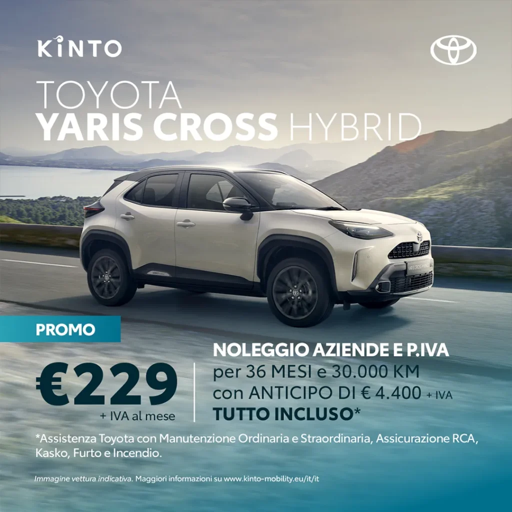 Canone applicato solo nel caso di noleggio della vettura con KINTO Italia S.p.A. Tutti gli importi sono da intendersi al mese, per 36 mesi e 30.000 km totali, IVA esclusa, salvo approvazione KINTO Italia S.p.A. Il canone pubblicizzato si riferisce a Yaris Cross 115 Active FWD, € 229,00 al mese, anticipo € 4.400,00. Canone ed anticipo indicati sono comprensivi del contributo del Concessionario al costo complessivo del noleggio pari ad € 328 + IVA a condizione che il Cliente abbia in precedenza inserito una richiesta di preventivo online sul sito toyota.it o kinto-mobility.it riservata a P. IVA e società. Sono incluse le coperture assicurative con le seguenti condizioni: massimale RCA pari a € 26.000.000 con franchigia a carico del cliente pari a € 500, Garanzia Furto & Incendio con Scoperto 10% minimo € 500 a carico del Cliente, Garanzia Kasko con franchigia pari a € 500 a carico del Cliente, PAI con massimale pari a € 50.000. Il canone riportato è un esempio calcolato utilizzando i parametri assicurativi della provincia di Torino. Il canone calcolato su altre province potrebbe subire variazioni. Altri servizi inclusi: manutenzione ordinaria e straordinaria in rete ufficiale Toyota, assistenza stradale 24h 7 giorni su 7 con servizio di traino presso il centro assistenza KINTO più vicino, immatricolazione, montaggio ed attivazione dispositivo antifurto LoJack Classic, messa su strada. Offerta valida per contratti sottoscritti entro il 31/12/2025, presso i concessionari che aderiscono all’iniziativa.